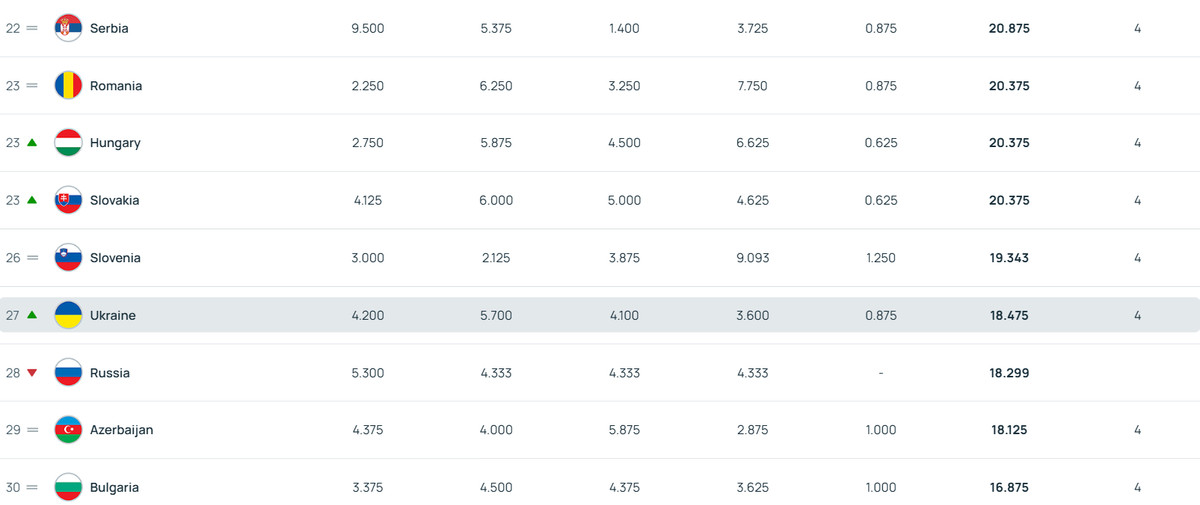 Тобто Україна дещо скоротила відставання від Словаччини та Угорщини, проте відпустила вперед Словенію. А Азербайджан та Болгарія навпаки, наблизилися до нас у таблиці.