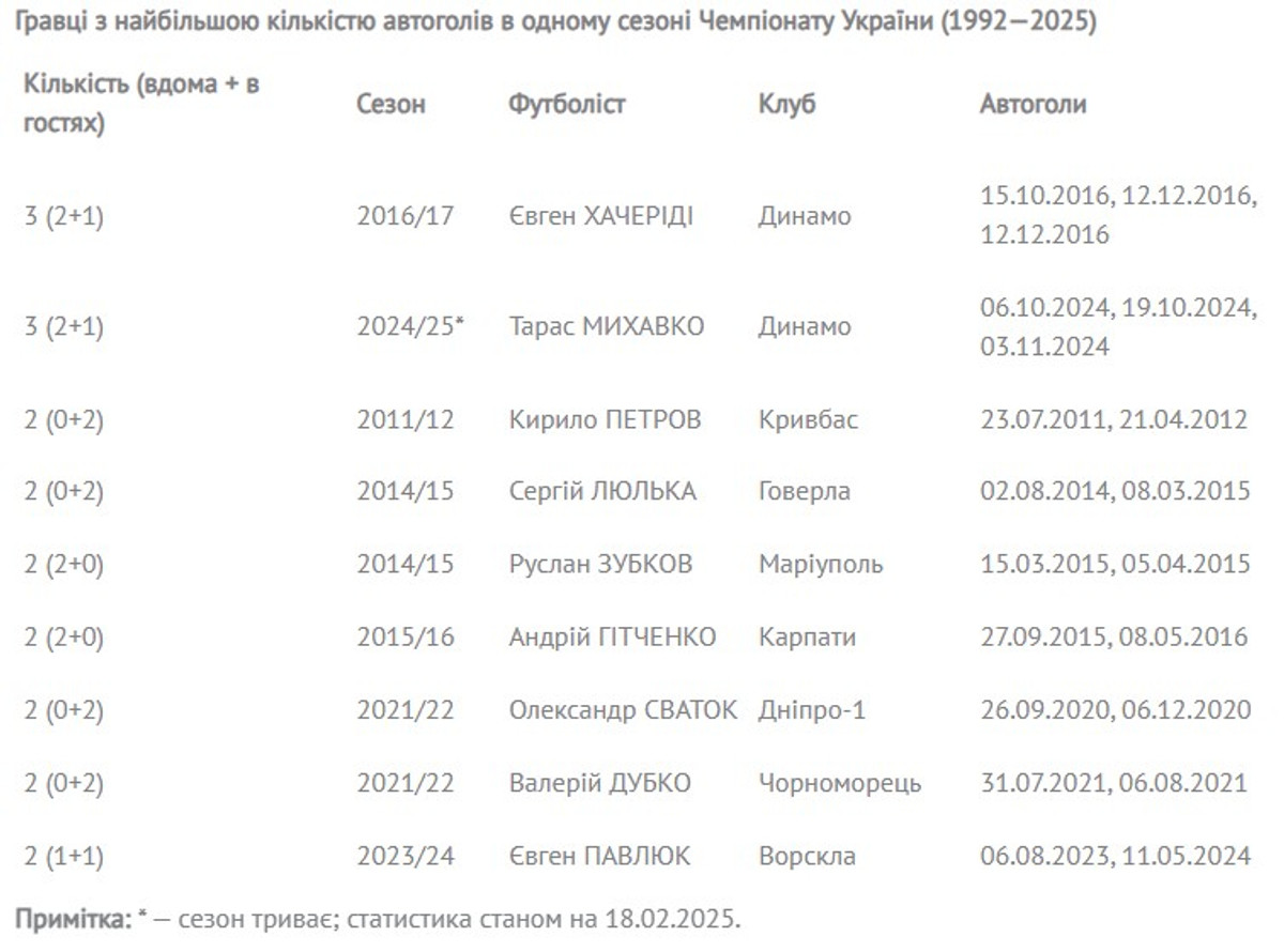 У ході першої частини сезону-2024/25 було зафіксовано вже вісім автоголів. Три з них записав на свій рахунок захисник Динамо – у домашніх матчах з Кривбасом (2:1), Інгульцем (5:2) та гостьовому з Оболонню (5:1).