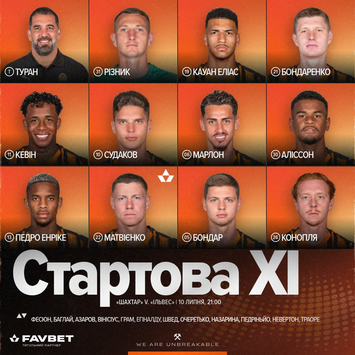 Шахтар: Різник, Конопля, Бондар, Матвієнко, Педро Енріке, Марлон Гомес, Аліссон, Бондаренко, Судаков, Кевін, Еліас