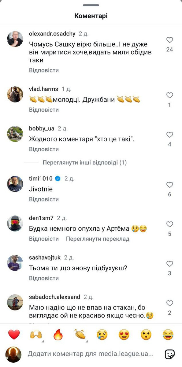 Нагадаємо, восени 2023 року стан Мілевського через вживання алкоголю настільки погіршився, що його госпіталізували. Як розповів Алієв у інтерв'ю Дмитру Гордону, Артем був у комі. Потім Мілевський публічно розкритикував друга за розголошення цих подробиць, після чого між ними почався вищезгаданий конфлікт.