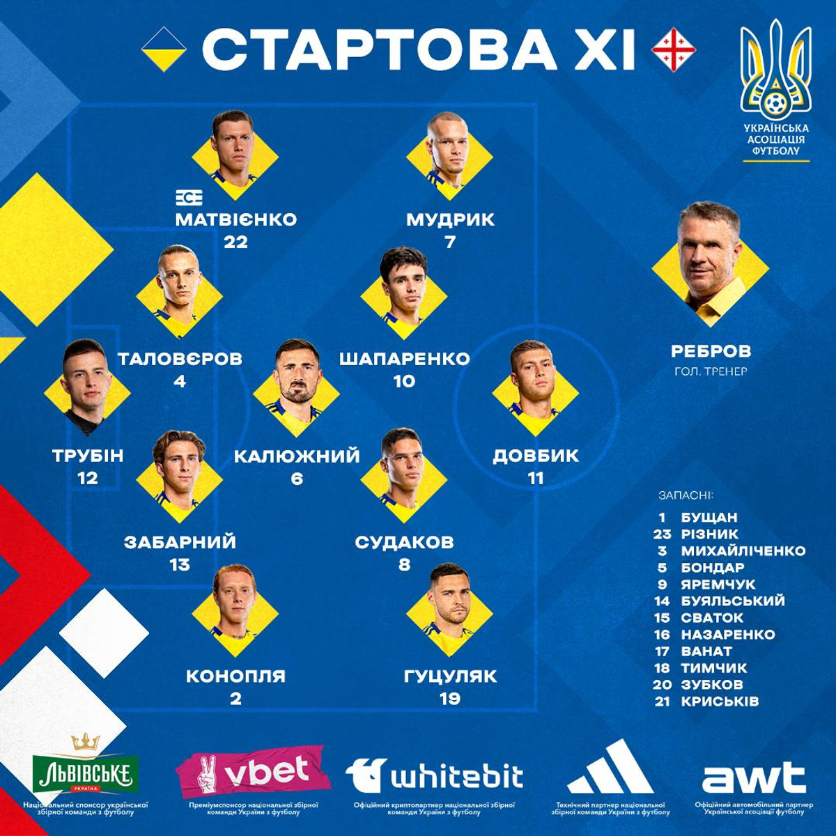 Україна: Трубін – Конопля, Забарний, Таловєров, Матвієнко – Калюжний, Судаков, Шапаренко – Мудрик, Гуцуляк, Довбик