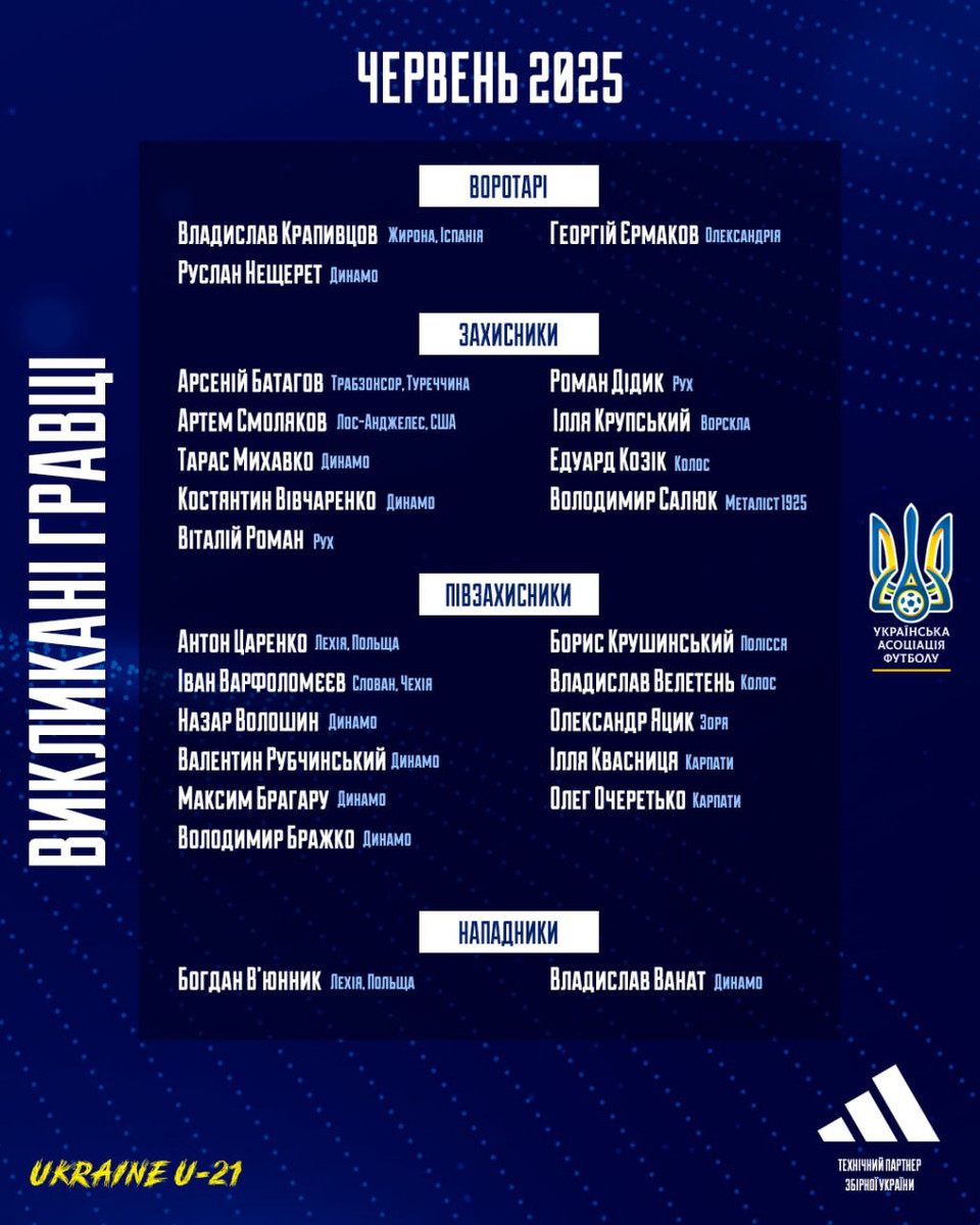 Воротарі: Руслан Нещерет (Динамо Київ), Георгій Єрмаков (Олександрія), Владислав Крапивцов (Жирона, Іспанія).