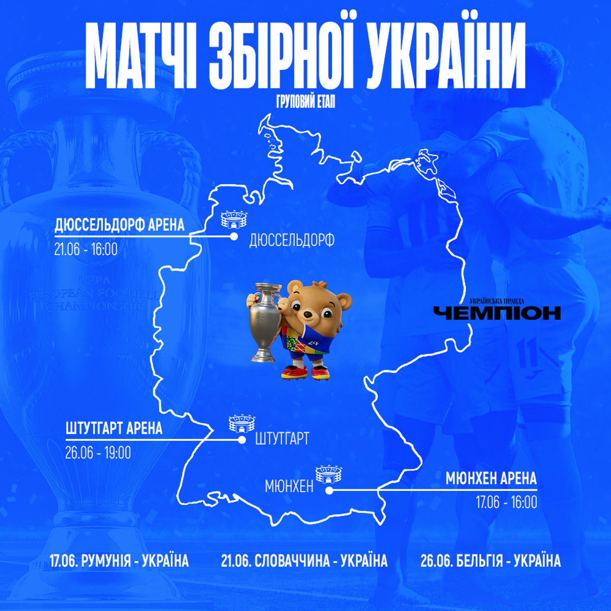 Українські футболісти на груповій стадії зіграють у Мюнхені ("Мюнхен Арена"), Штутгарті ("Штутгарт Арена") та Дюссельдорфі ("Дюссельдорф Арена"). Нагадаємо, у матчах під егідою УЄФА стадіони не можуть називатися іменами спонсорів через рекламні контракти організації.