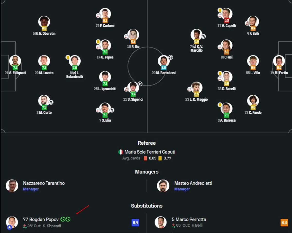 Зауважимо, що це лише другий матч Попова за Емполі. Він дебютував у п’ятницю, 15 серпня, у грі 1/32 Кубку Італії проти Реджани. Попов вийшов у основі та провів на полі 85 хвилин. Його команда перемогла в серії пенальті.