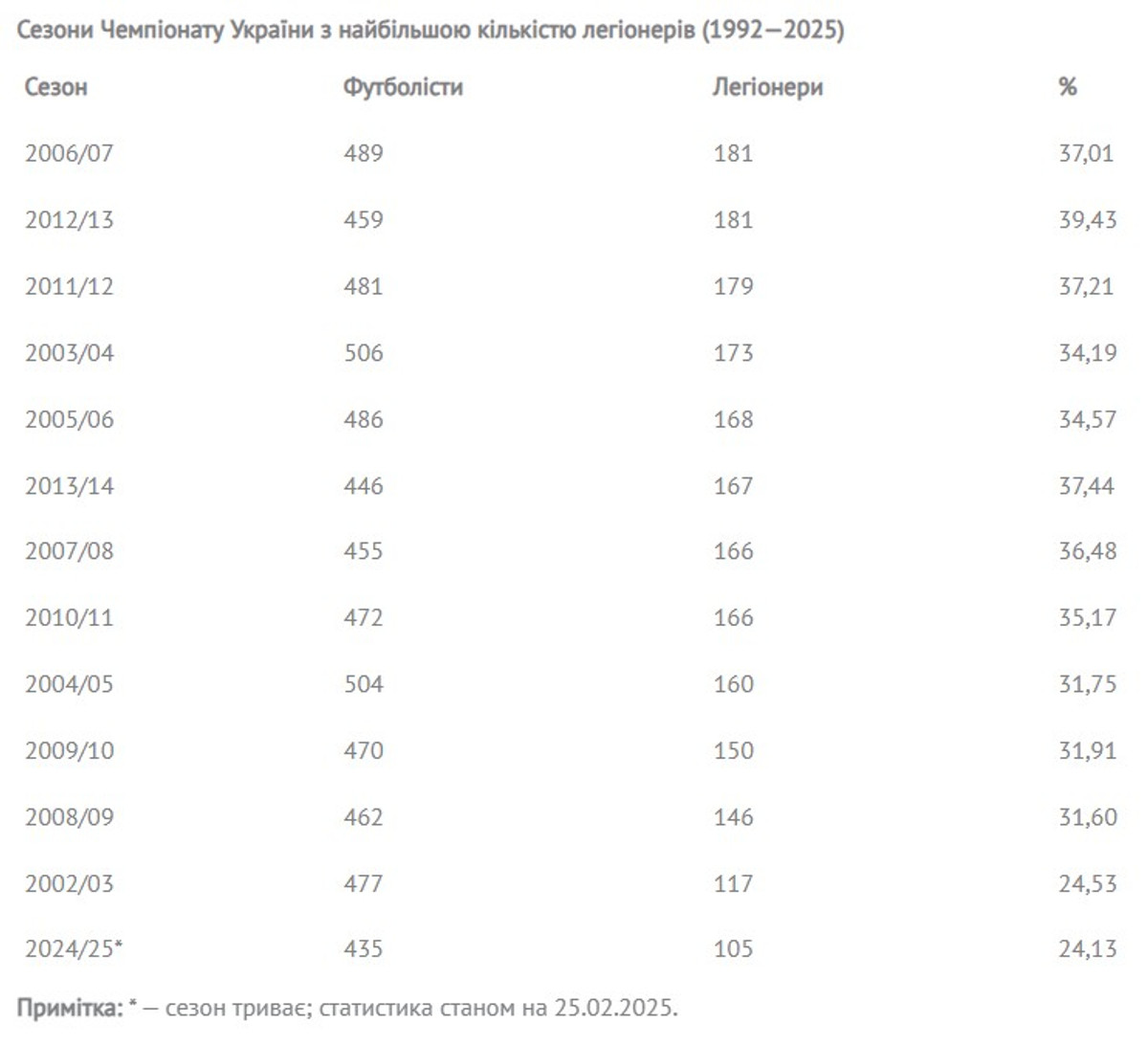Таким чином, за підрахунками ліги, вперше за 11 років загальна кількість легіонерів в чемпіонат України досягла відмітки у 100 футболістів. Наразі в сезоні-2024/25 було задіяно 435 гравців, в тому числі 105 легіонерів (24,13%). Обидві цифри ще можуть збільшуватися до завершення сезону.
