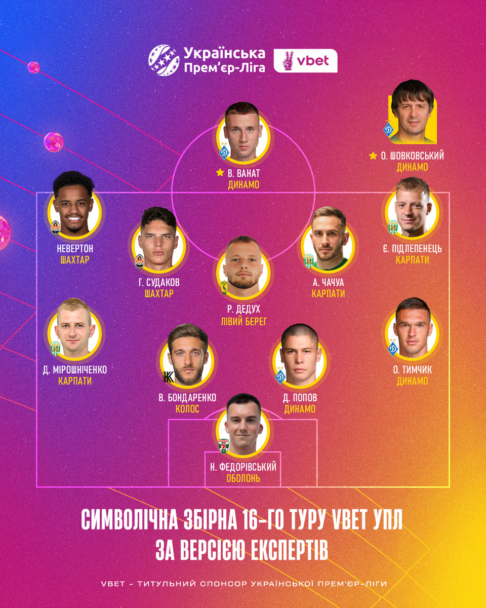 Ведучі, експерти, коментатори УПЛ ТБ та представники ЗМІ визначили найкращого гравця, тренера та символічну збірну Української Прем'єр-ліги за підсумками 16 туру.