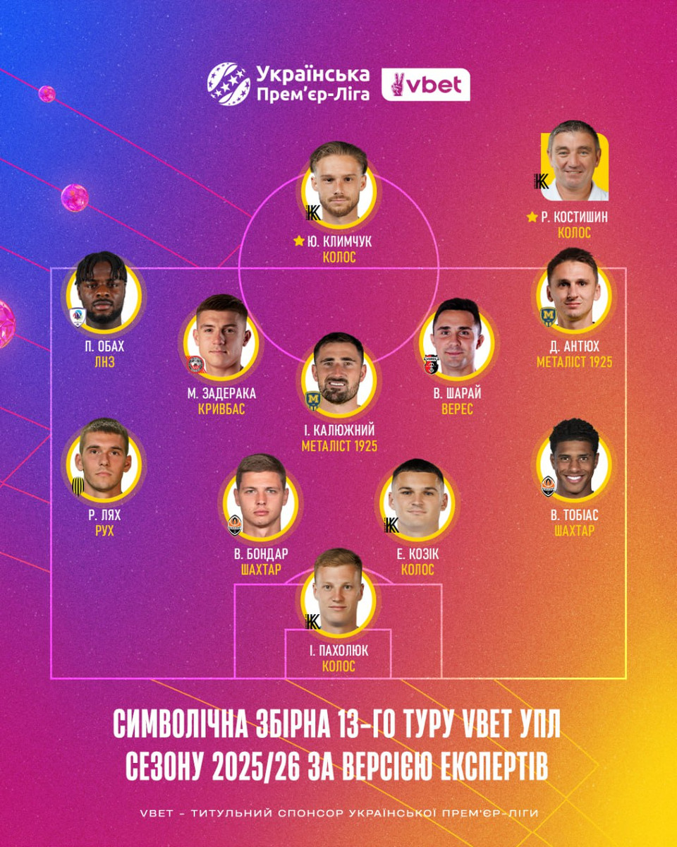 Українська Прем'єр-ліга оголосила найкращого гравця, тренера та символічну збірну 13 туру.