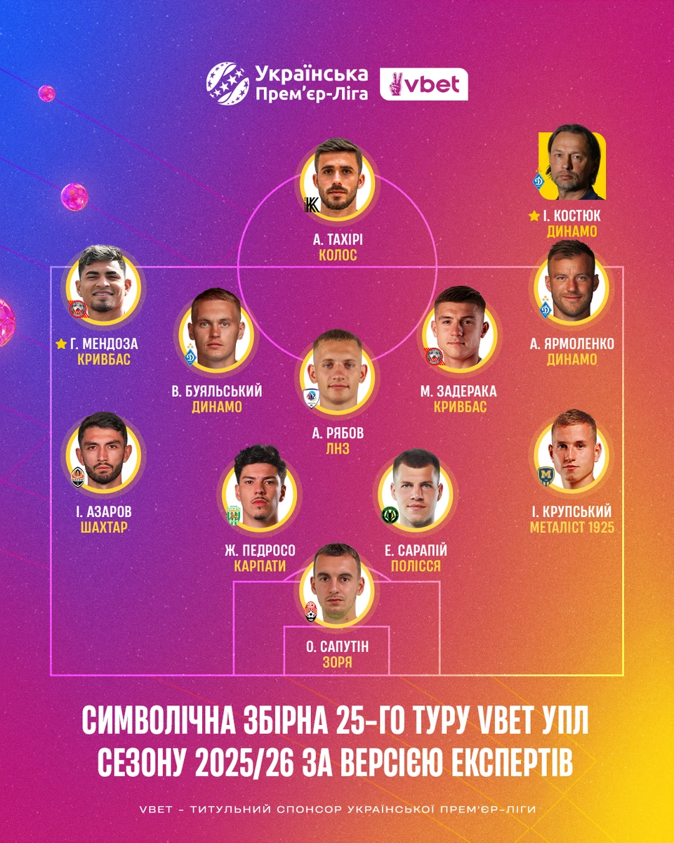 Українська Прем'єр-ліга склала символічну збірну 25-го туру, а також назвала найкращого тренера та гравця.