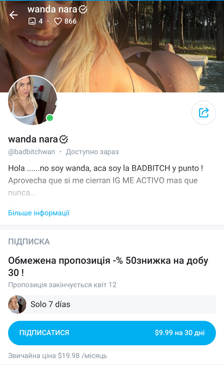 Зазначимо, що Ванда вже не вперше заводить акаунт на платформі для дорослих. Аргентинська модель має власну сторінку на сайті DivasPlay, де колишні зірки еротичної індустрії публікують свої оголені знімки.