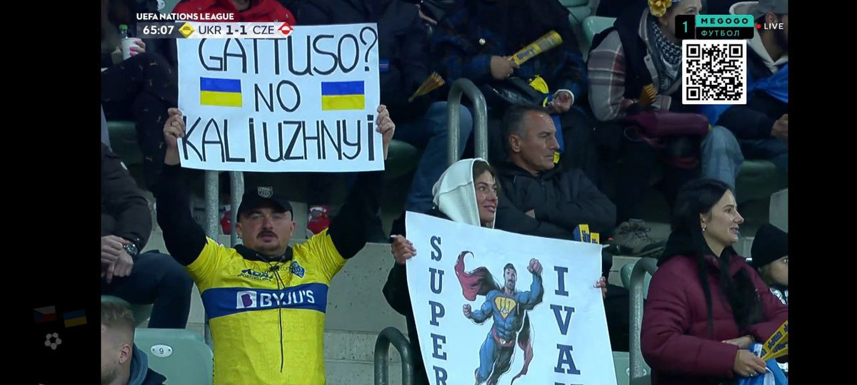 А персональні фанати Калюжного підготували оригінальні банери. На одному – надпис "Гаттузо? Ні, Калюжний", а на іншому – "Супер Іван" із зображенням оперника в образі супермена.
