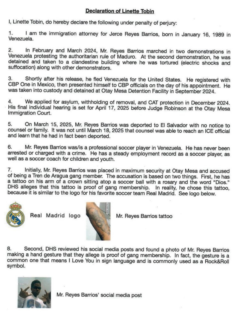 Американська влада відмовила йому в політичному притулку та депортувала до Сальвадору. Причина? Його татуювання, яке, за словами прикордонників, належить небезпечному угрупованню Tren de Aragua.