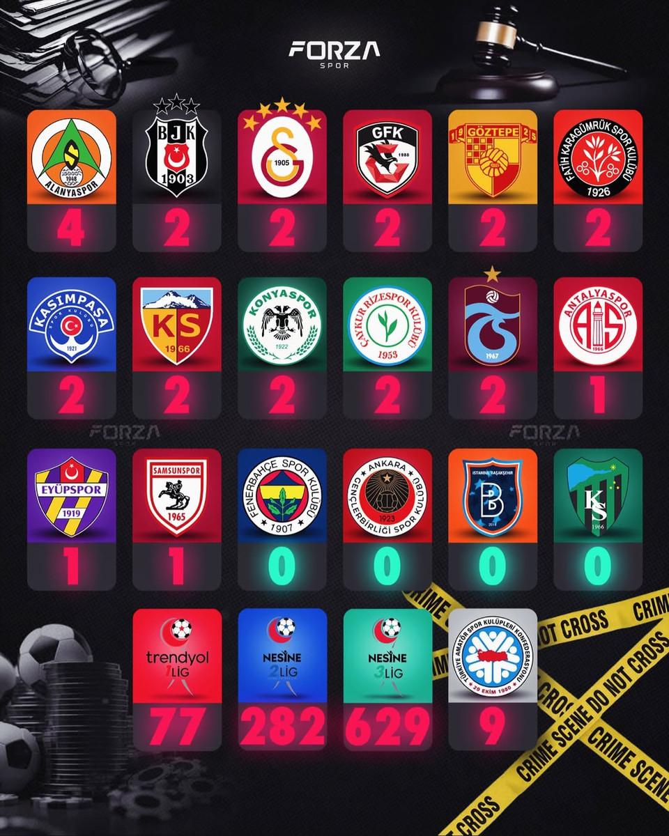 У списку аж 27 гравців турецької Суперліги, зокрема представники грандів – Галатасарая і Бешикташа. Очолив список із найбільшою кількістю відкритих справ серед представників елітного дивізіону Аланьяспор, в якого під підозрою опинилися 4 гравці.