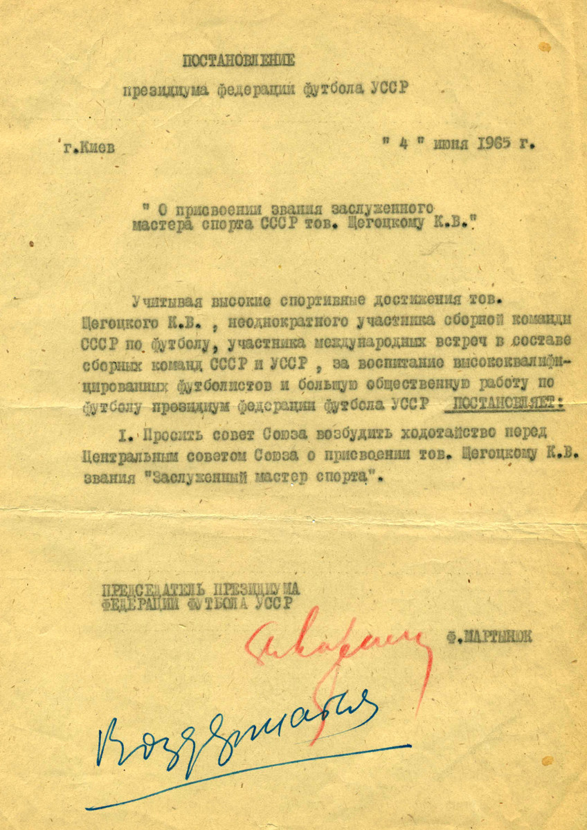 Згідно з тодішніми нормативами радянського спорту, він мав би отримати знак "Заслужений майстер", як багато хто з його партнерів по збірній СРСР. Однак пробити броню бюрократії так і не вдалося – ні "по гарячих слідах", ні в часи "відлиги". В 1965 році Федерація футболу УРСР подала клопотання про присвоєння Костянтину Щегоцькому найвищого спортивного звання. Але в якомусь із високих московських кабінетів наклали візу – "Утриматися".