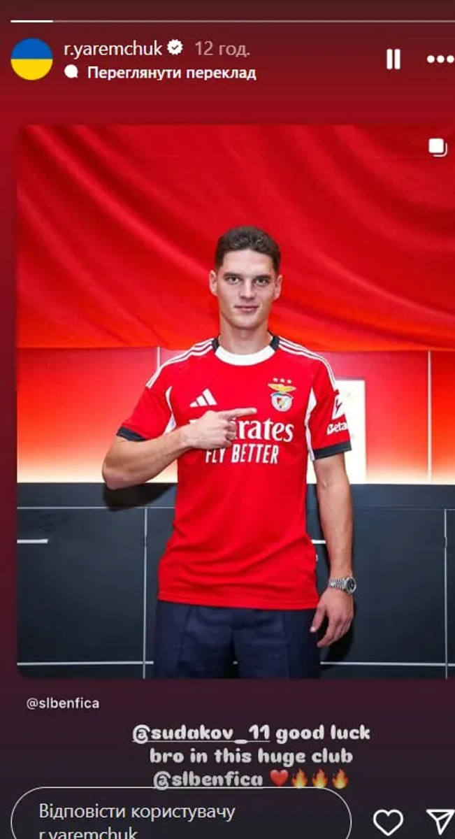 Яремчук звернувся до Судакова після його трансферу в Бенфіку: що побажав земляку