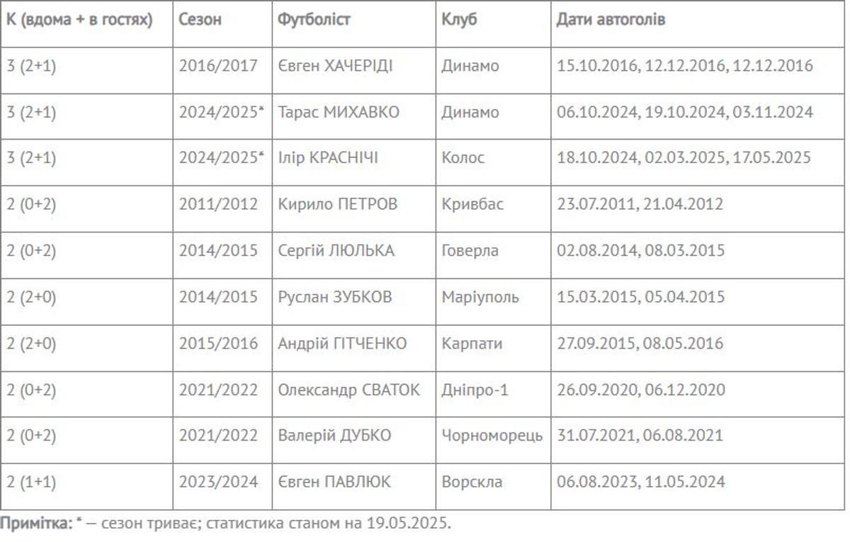Футболісти з найбільшою кількістю автоголів в одному сезоні УПЛ