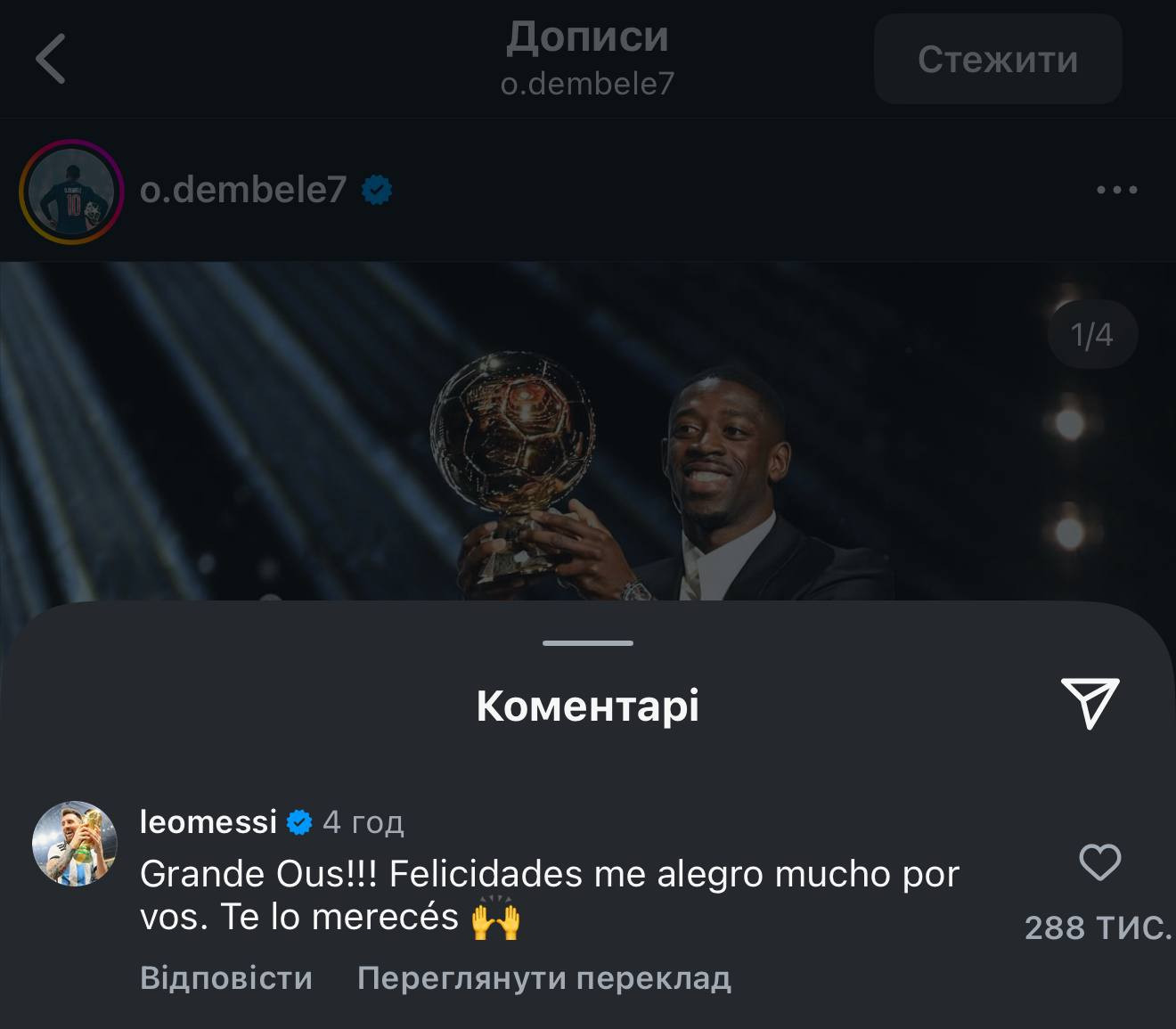 Нагадаємо, футболісти грали разом у Барселоні з 2017 по 2021 рік. Дембеле перейшов до ПСЖ у 2023-му – саме того року Мессі залишив французький клуб та перебрався в Інтер Маямі.