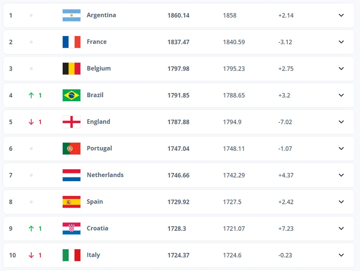 У топ-10 чотири команди змінили своє положення. Бразилія стала 4-ю, обійшовши Англію. Хорватія піднялась на 9 місце, залишивши за собою Італію.