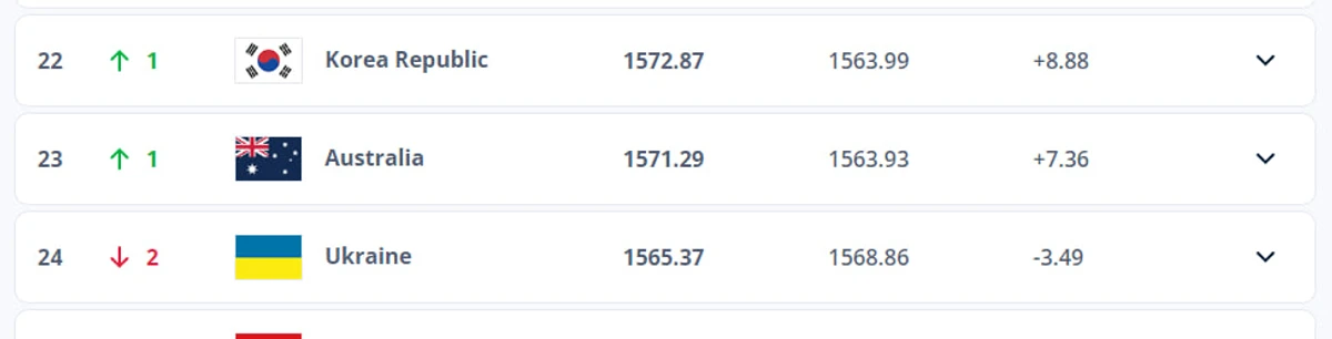 Збірна України втратила дві позиції та посідає 24 місце (1565,37 бала). Команду обійшли збірні Південної Кореї та Австралії.