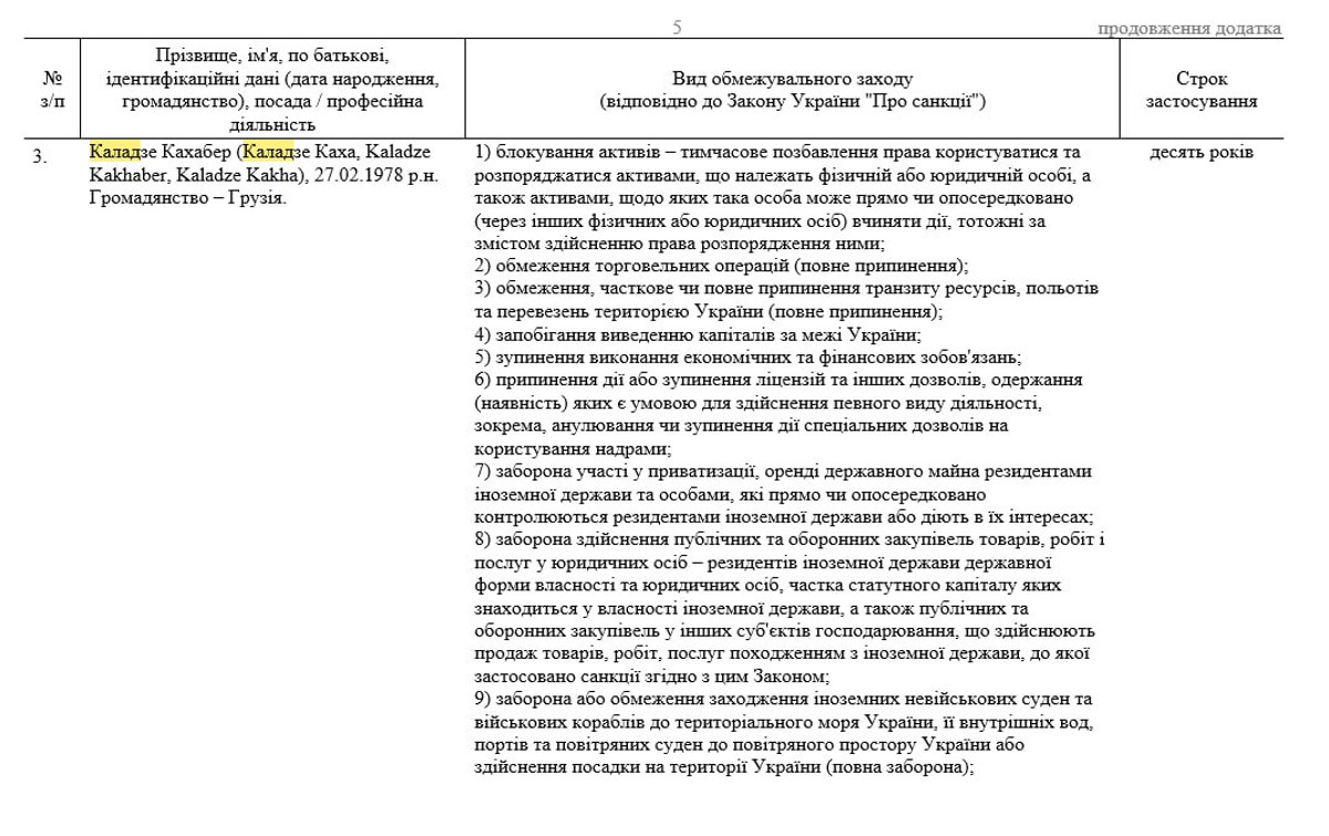 Під санкції потрапив мільярдер Бідзіна Іванішвілі, а також ще 18 осіб, які пов'язані з ним та партією Грузинська мрія. Каладзе потрапив під санкції на 10 років.