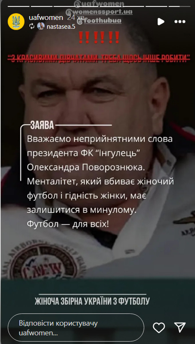 Жіноча збірна України та голова Комітету жіночого та дівочого футболу Анастасія Кліпаченко висловили своє обурення щодо недавніх слів президента Інгульця Олександра Поворознюка про жіночий футбол.