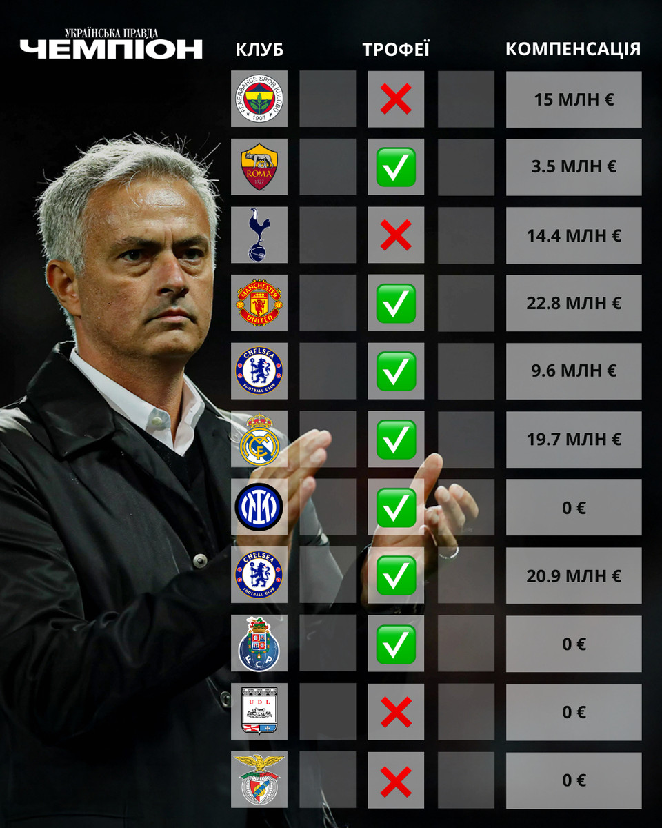 Нарешті, турецький Фенербахче, з яким Моурінью, як і з Тоттенгемом, не виграв жодного трофея, за розрив контракту виплатить Жозе 15 мільйонів у європейській валюті.
