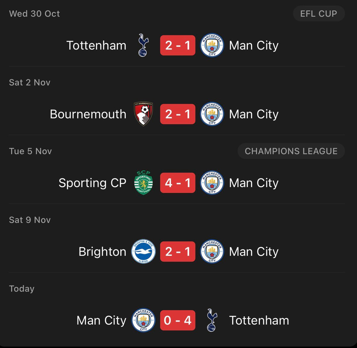 До цього Манчестер Сіті встиг програти тому ж Тоттенгему (1:2) у Кубку Ліги, Борнмуту (1:2) та Брайтону (1:2) в АПЛ, а також Спортингу (1:4) в Лізі чемпіонів.