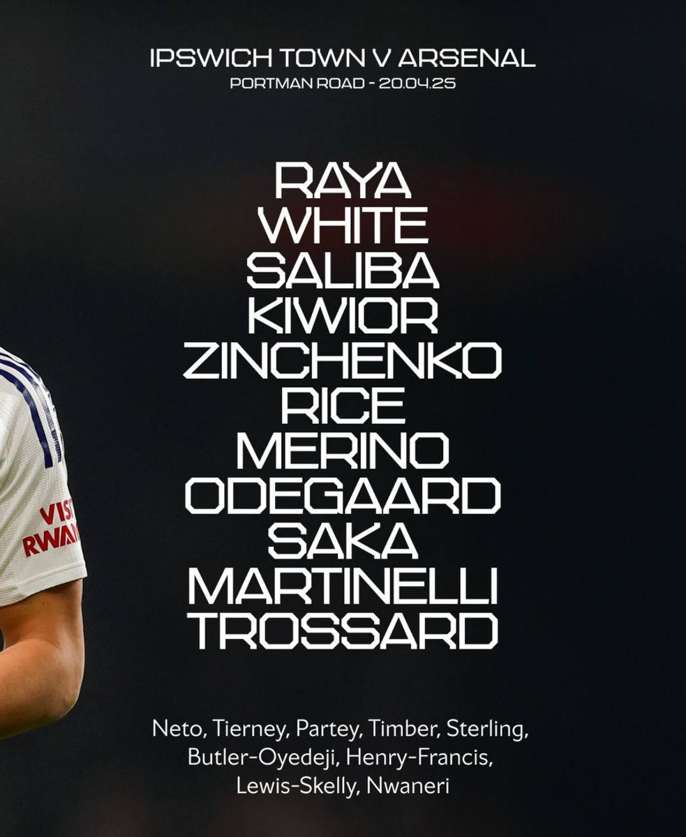 Склад Арсенала: Райя, Вайт, Саліба, Ківьор, Зінченко, Райс, Меріно, Едегор, Сака, Мартінеллі, Троссар