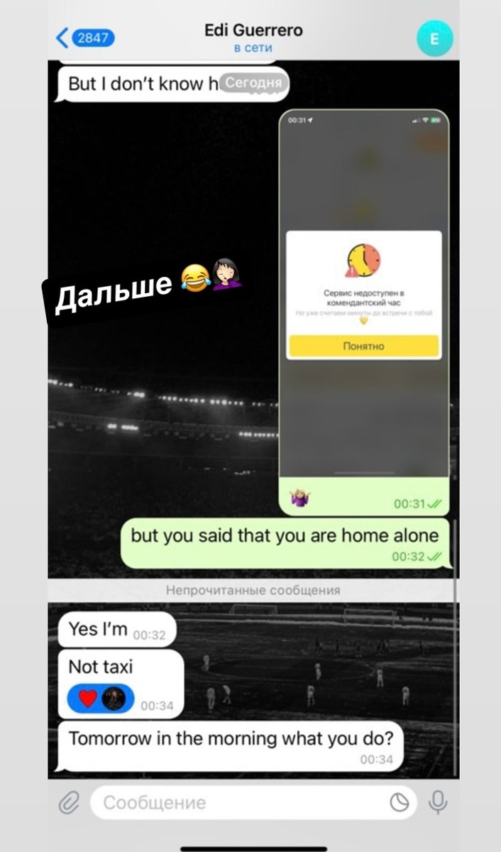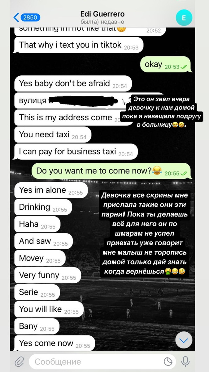 Крижановська виклала скріншоти переписок, які свідчать про те, що Герреро, як мінімум, намагався зрадити їй. Спочатку вона поділилася листуванням нападника з іншою дівчиною, яку він запросив до квартири, де жив разом із Крістіною. Пізніше дівчина показала їхній особистий діалог, що відбувся незадовго до розставання.