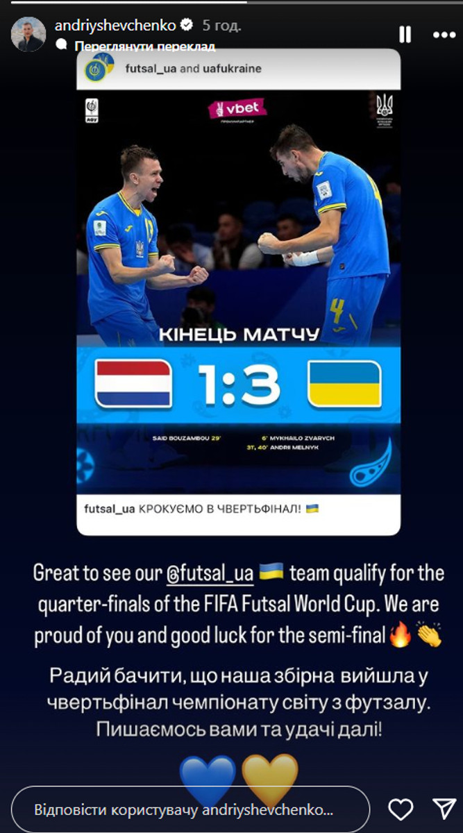"Радий бачити, що наша збірна вийшла у чвертьфінал чемпіонату світу з футзалу. Пишаємось вами та удачі далі", – написав Шевченко.