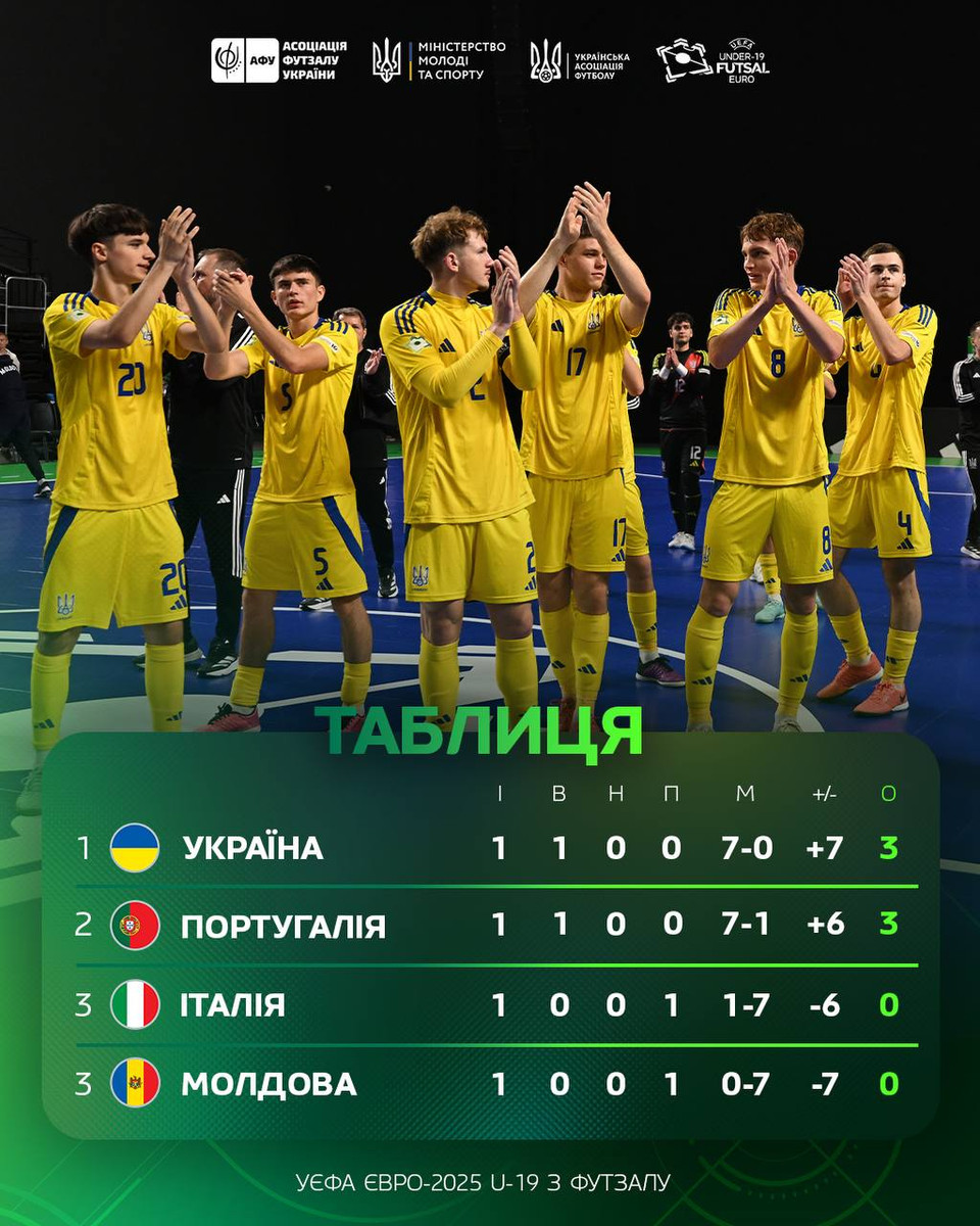 Юнацька збірна України з футзалу U-19 очолила групу A на чемпіонаті Європи-2025, що проходить у столиці Молдови, Кишиневі.