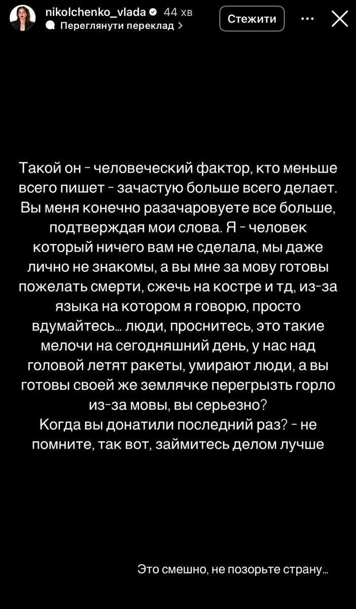 "Ось він – людський фактор: ті, хто найменше пише, зазвичай роблять найбільше. Ви, звісно, все більше мене розчаровуєте, лише підтверджуючи мої слова. Я – людина, яка нічого вам не зробила, ми навіть особисто не знайомі, а ви мені через мову готові побажати смерті, спалити на вогнищі тощо.