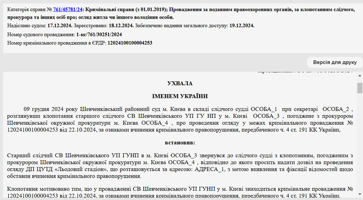 Після розгляду аргументів поліції, суд ухвалив рішення, яким дозволив провести огляд Палацу спорту.