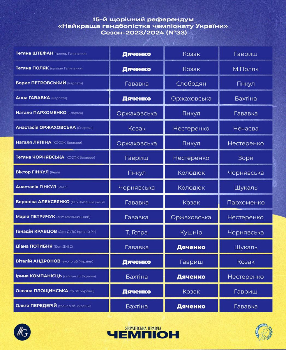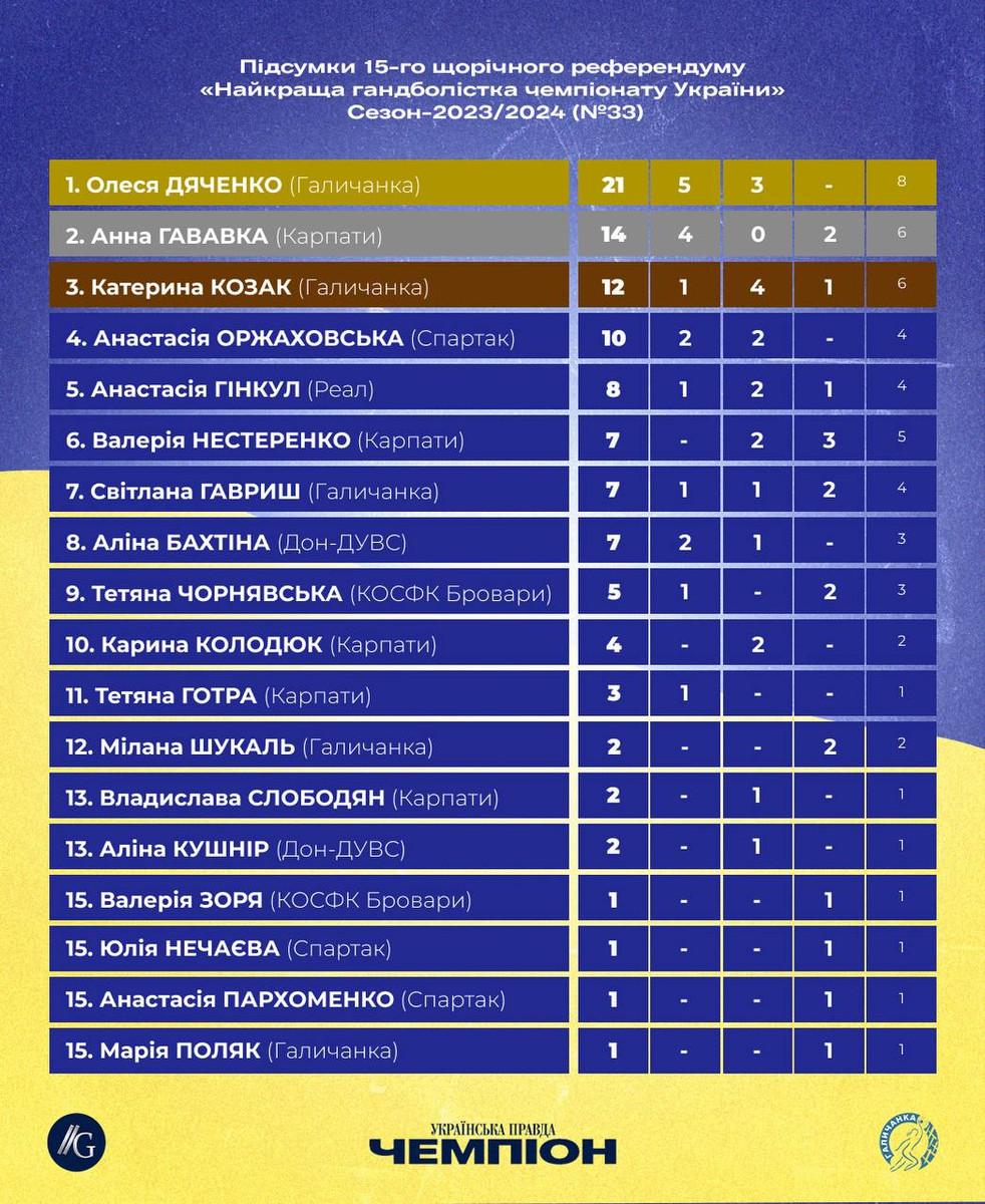 Тріумфаторкою XV щорічного референдуму щодо визначення найкориснішого гравця жіночого чемпіонату України з гандболу стала 21-річна розігруюча львівської Галичанки Олеся Дяченко.