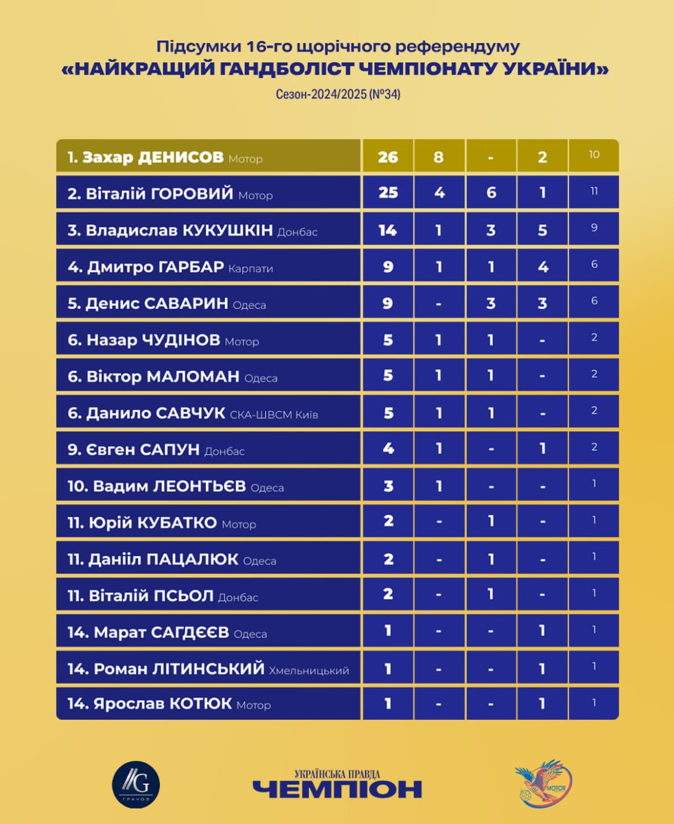 Тріумфатором 16-го щорічного референдуму на звання MVP (найціннішого гравця) чоловічої Суперліги України став 35-річний півсередній Мотора Захар Денисов. Капітан запоріжців уже визнавався найкращим гравцем у 2020 та 2024 роках, а тепер – і за підсумками сезону-2024/2025.