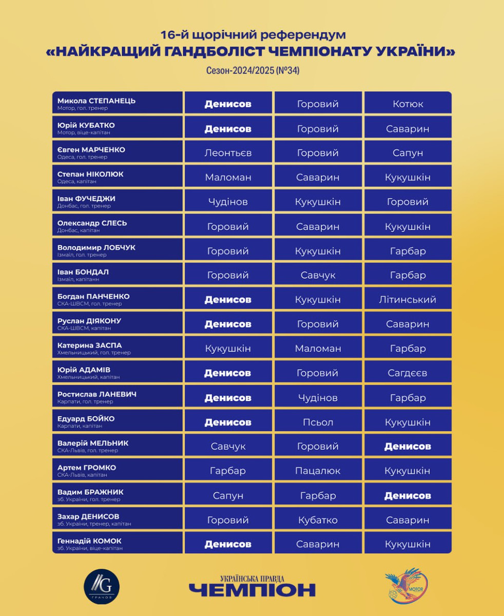 - Також слід відзначити підтвердження легендарного статусу Захара Денисова – він вийшов на перше місце за кількістю набраних балів в історичному реєстрі за всі роки проведення опитування. Крім того, за підсумками цього сезону він став найчастіше згадуваним гандболістом серед респондентів – його відзначали 68 разів.