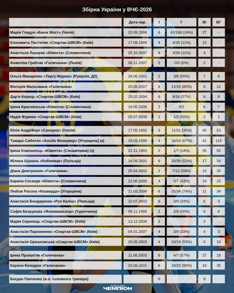 Україна: Гладун (6/27, 22%), Пастеляк (1/6, 17%), Лазорак (1/5, 20%); Смбатян (5/8), Шукаль (3/6), Росоха (3/3), Пархоменко (3/3), Колодюк (2/2), Мальована (2/3), Оржаховська (1/3), Корець (1/4), Прокоп'як (1/2), Андрійчук (0/4), Бондаренко, Соскида (0/1), КОМПАНІЄЦЬ (н.в.).