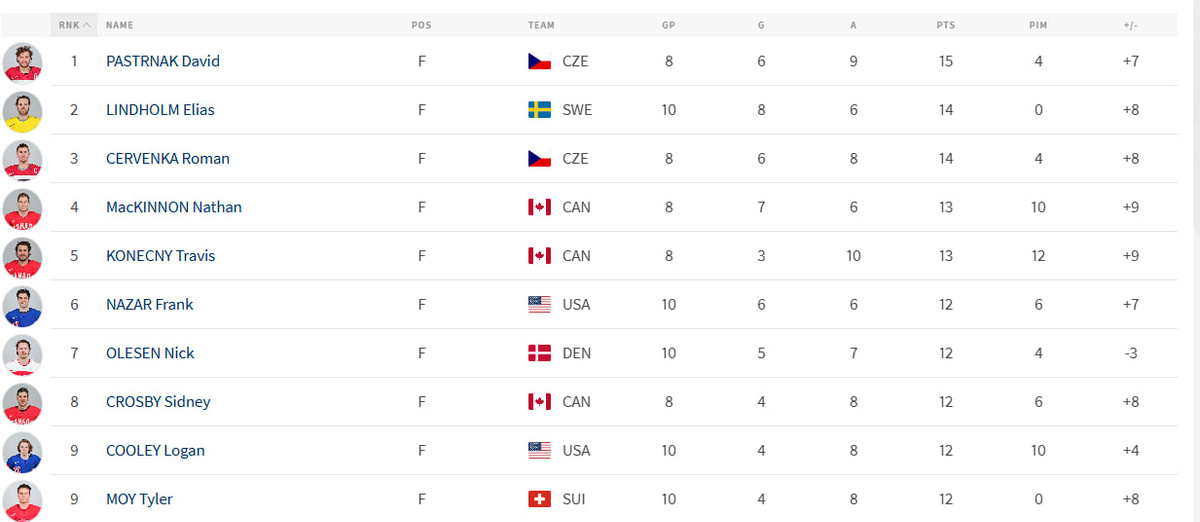 Лідером чемпіонів світу збірної США став Френк Назар. 21-річний нападник Чикаго закинув 6 шайб, до яких додав 6 асистів.