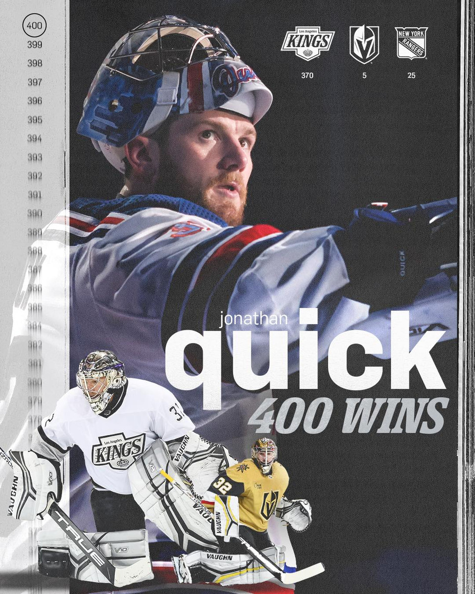 Так, Квік став першим американським воротарем, який досяг відмітки у 400 перемог в межах НХЛ. У матчі проти Голден Найтс Квік відбив 34 кидких з усіх 36, що летіли у його ворота.
