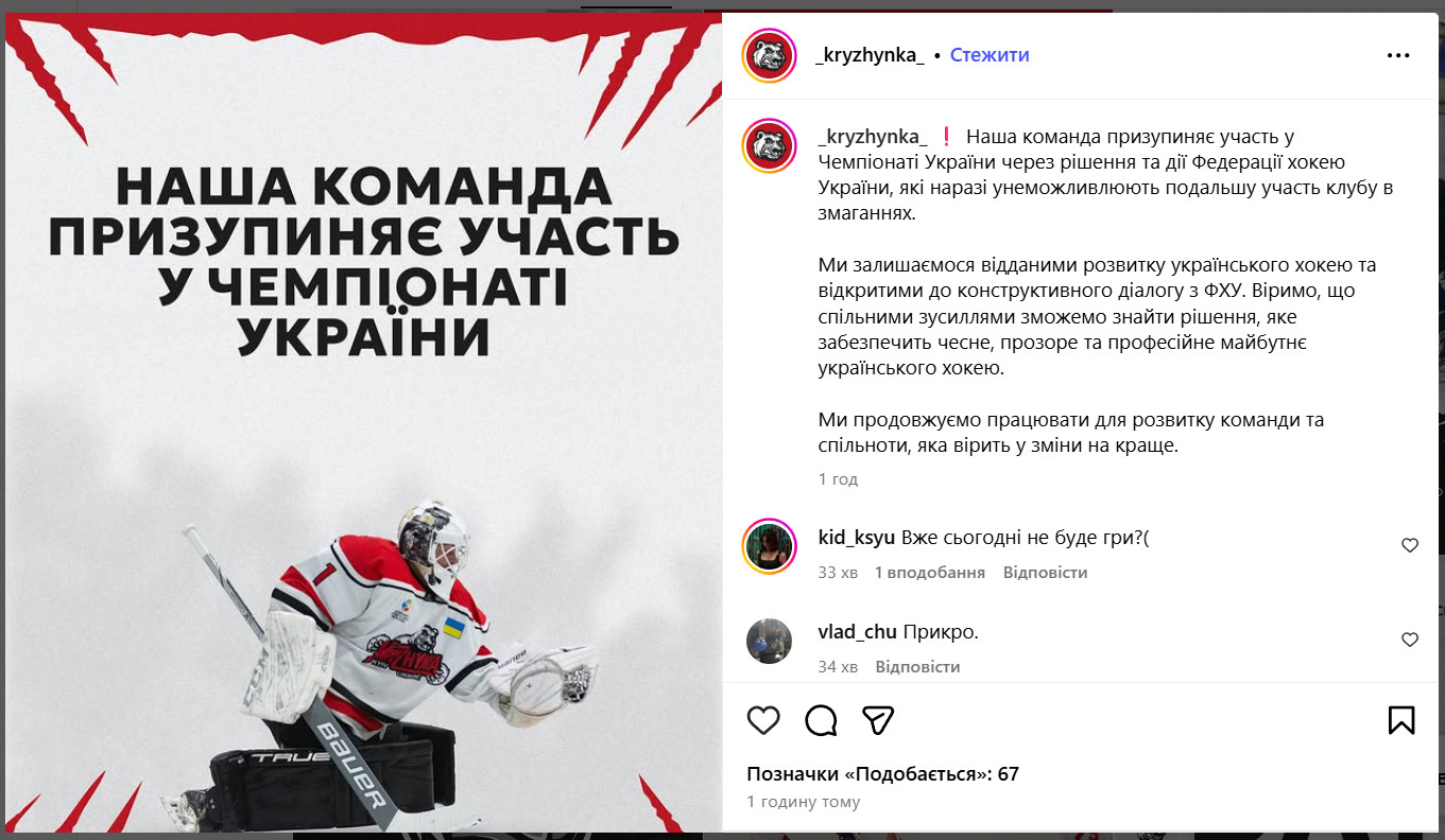 "Ми залишаємося відданими розвитку українського хокею та відкритими до конструктивного діалогу з ФХУ. Віримо, що спільними зусиллями зможемо знайти рішення, яке забезпечить чесне, прозоре та професійне майбутнє українського хокею. Ми продовжуємо працювати для розвитку команди та спільноти, яка вірить у зміни на краще", – йдеться в повідомленні.