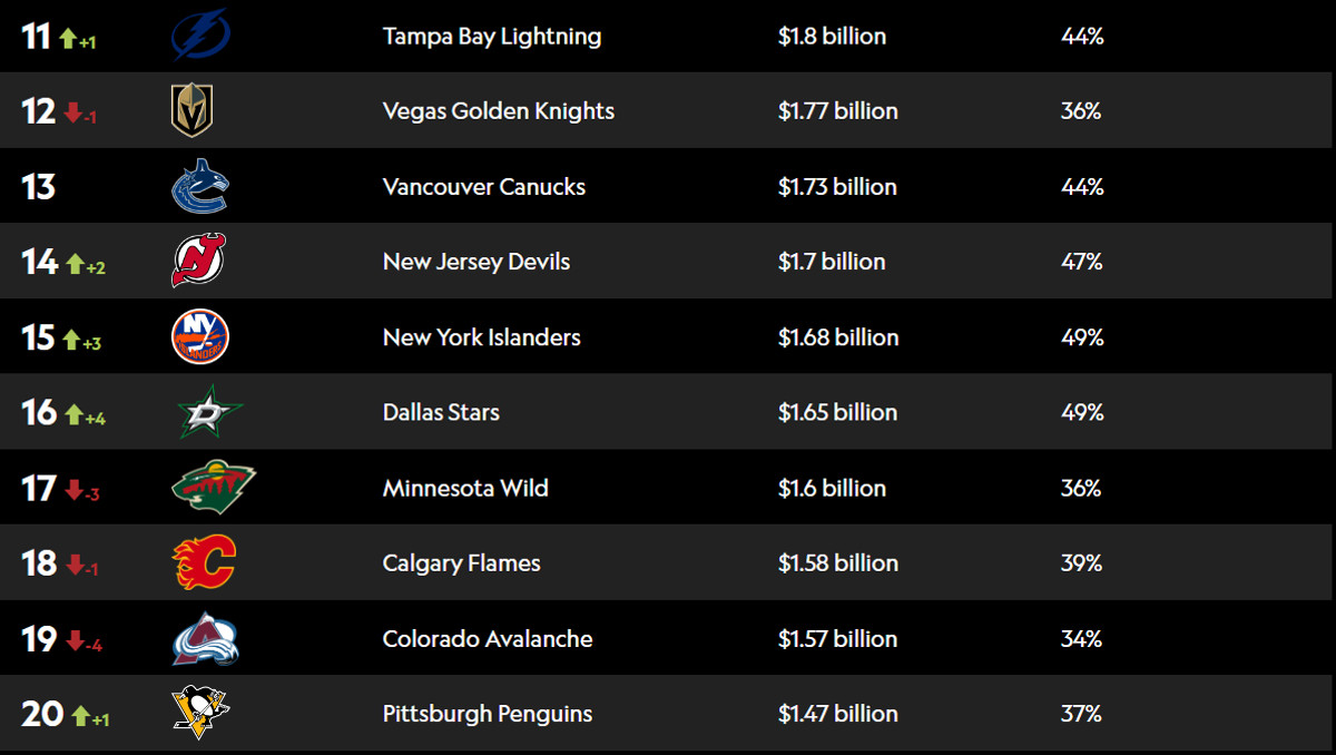 До п'ятірки найкращих увійшли Монреаль Канадієнс (2,93 млрд), Бостон Брюїнз (2,67 млрд) та Лос-Анджелес Кінгз (2,5 млрд).