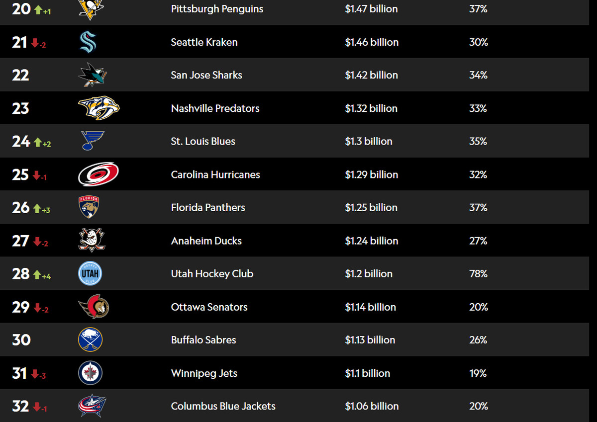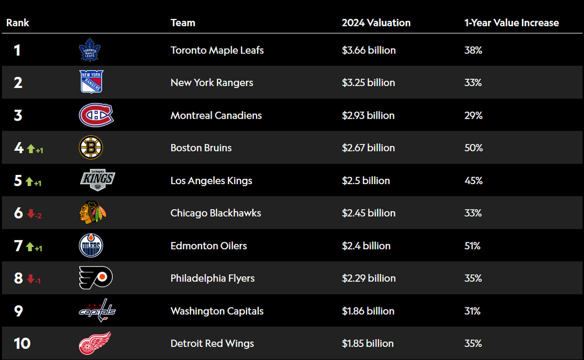 Джерело вважає, що найдорожчим клубом є Торонто Мейпл Ліфс. Команду оцінюють у 3,66 млрд доларів, що на 38% більше, ніж рік тому.