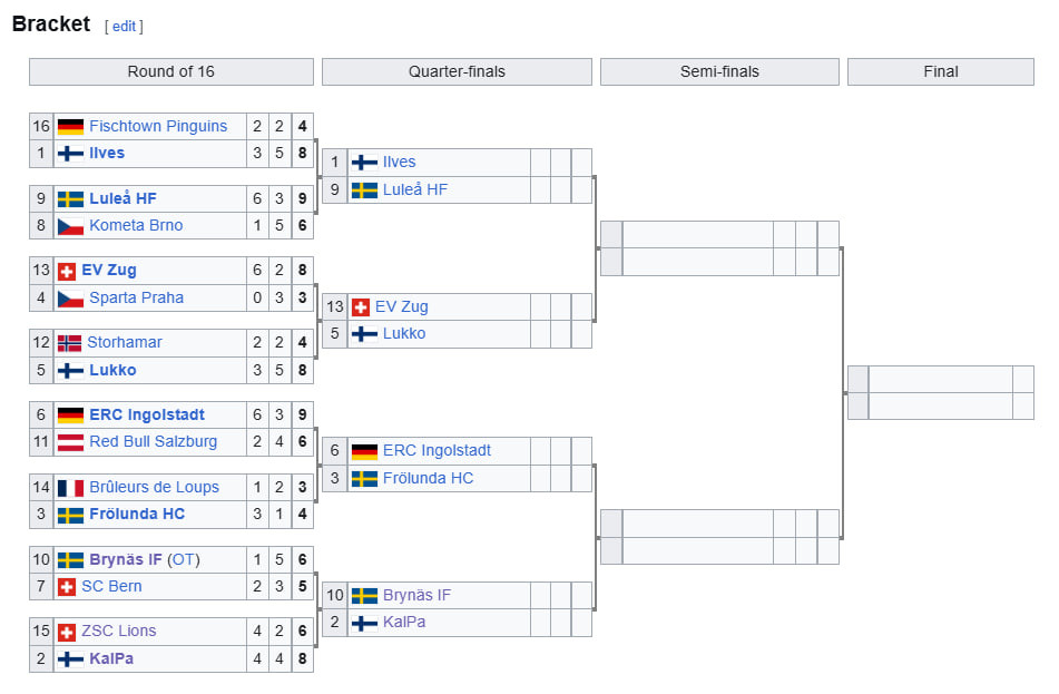 Боротьбу за трофей також продовжать інші представники СМ-ліги: Ільвес і Лукко. У грі залишилися і три клуби Швеції: Лулео, Фрелунда і Брюнес.