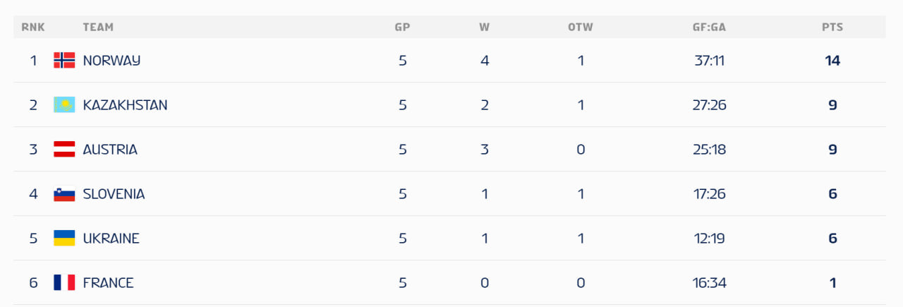 Потім лише в овертаймі поступилися Норвегії. Решту матчів норвежці виграли в основний час, що дозволило впевнено отримати путівку до еліти.