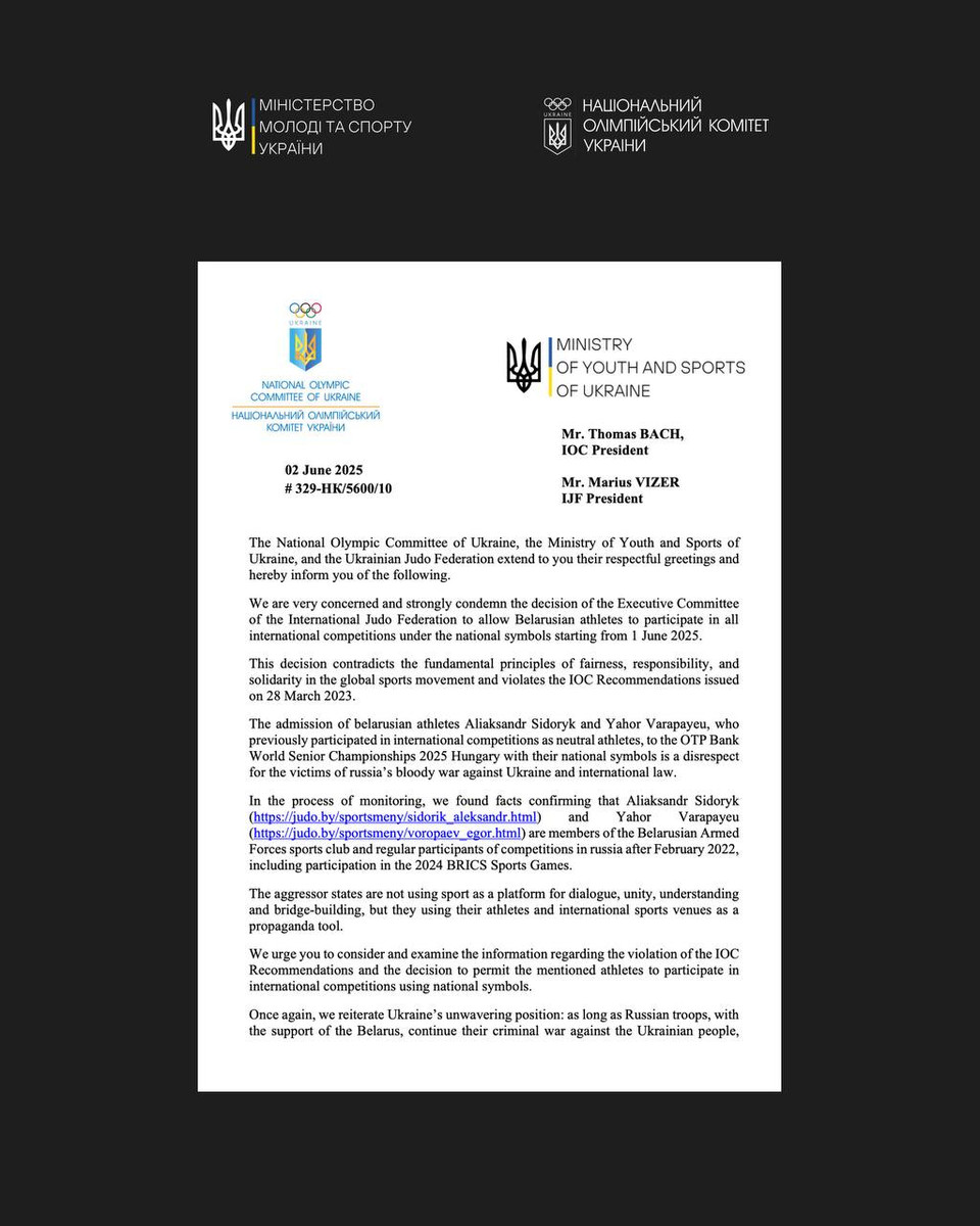 "Національний олімпійський комітет України, Міністерство молоді та спорту України та Федерація дзюдо України надіслали офіційне звернення до президента МОК Томаса Баха та президента Міжнародної федерації дзюдо Маріуса Візера із закликом переглянути рішення щодо участі білоруських спортсменів у змаганнях під національними прапорами.