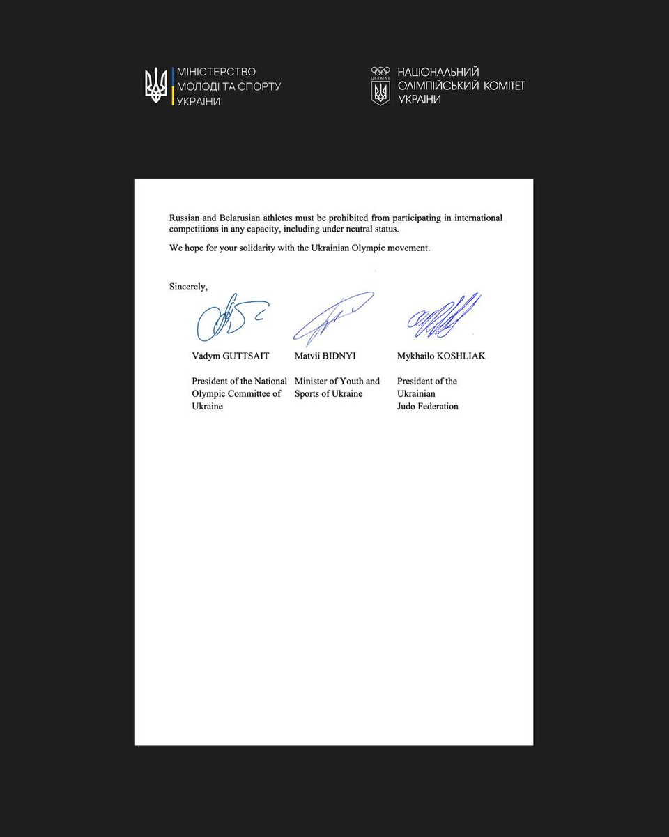 Українська сторона закликає Міжнародну федерацію дзюдо та МОК ретельно перевірити викладені факти та переглянути рішення про допуск згаданих спортсменів до участі у змаганнях із використанням національної символіки", – йдеться у повідомленні.