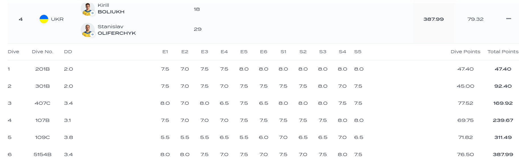 Болюх та Оліферчик добре виступали протягом більшої частини дистанції. Проте п'ятий стрибок з найвищим рівнем складності отримав найнижчі оцінки від суддів, що зіграло свою роль у розподілі команд на подіумі, куди українці не потрапили – вони завершили фінал на четвертому місці, заробивши 387,99 бала.