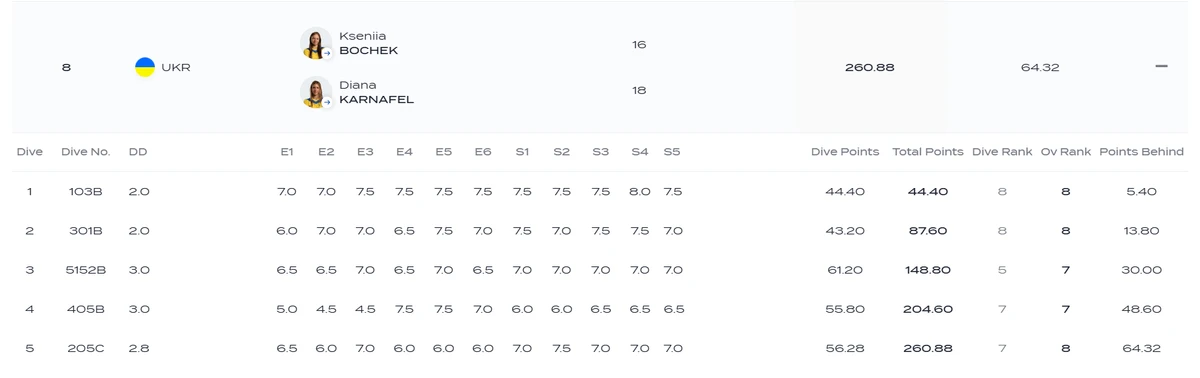 Ксенія та Діана, для яких цей ЧС-2025 став першим у кар'єрі, виконали п'ять стрибків. За них вони в сумі отримали від суддів 260,88 бала. На жаль, цього вистачило лише для того, щоб посісти восьме місце.