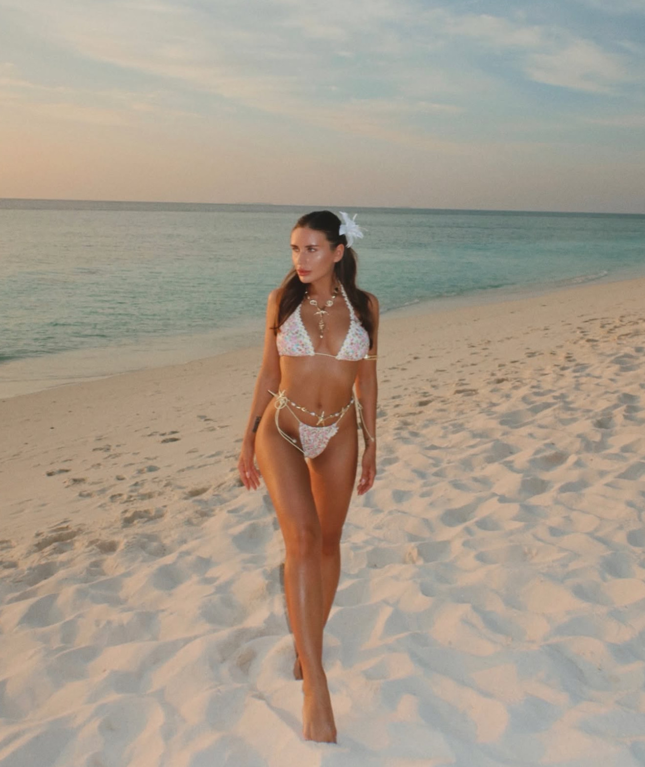 На світлинах дівчина позує: у стильному купальнику з екзотичною квіткою у волоссі на тлі бірюзового океану та білосніжного піску.