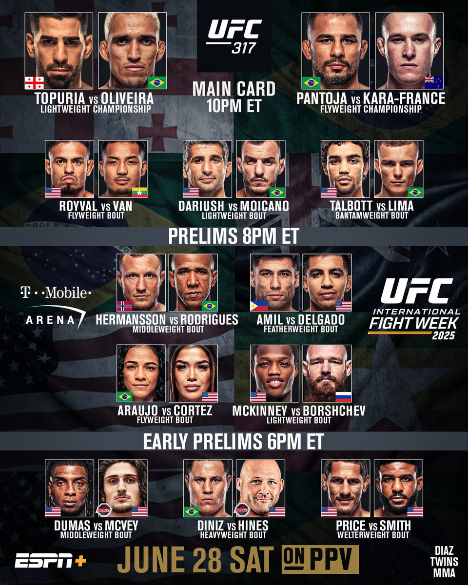 Найважливішою інтригою турніру UFC 317 стане бій за вакантний титул у легкій вазі між Ілією Топурією та Чарльзом Олівейрою. Після того як Іслам Махачєв офіційно оголосив про перехід у напівсередню вагу, пояс залишився без володаря, і тепер за нього зійдуться представники різних поколінь ММА.