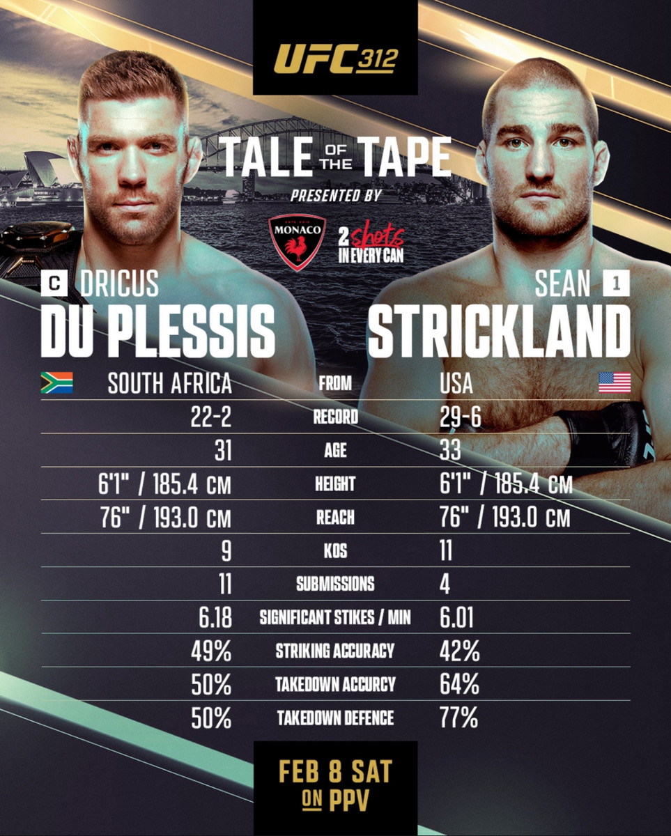 Цей бій обіцяє стати справжнім зіткненням стилів: агресивна манера Дю Плессі проти технічної боксерської майстерності та стійкості Стрікленда. Чи зможе Дрікус захистити свій титул, або ж Стрікленд вкотре доведе, що його непередбачуваність і ментальна загартованість – ключ до домінування в октагоні?